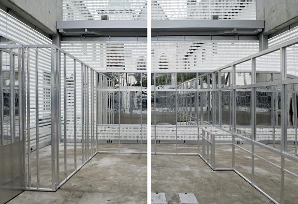 Die vertikalen Module der Skulptur überlagern sich mit den horizontalen Streifen der Lichthaus-Fassade, so daß ein räumliches Raster entsteht. Die Wände der Installation umschliessen einem Raum, aber ihre bespiegelte Oberfläche löst sich in den Reflexionen und Leerstellen der Struktur auf. Es entsteht ein Bildraum, der die optische Illusion einer schwebender Struktur verstärkt und einen imaginären Raum öffnet.