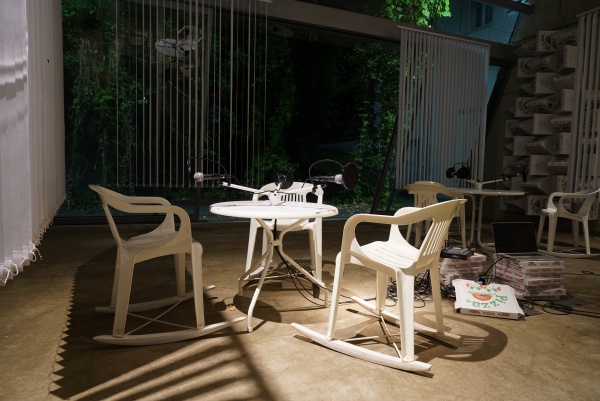 Im Lichthaus stehen drei Tische mit je drei Mikrofonen, die laufend „on air“ sind. Ihre Aufzeichnung wird live in nächstem Umkreis auf der Frequenz 87,5 gesendet. Dieser Sendeort wird akustisch von schallzerstreuenden Formen und visuell durch vertikale Lamellenvorhänge gefasst.